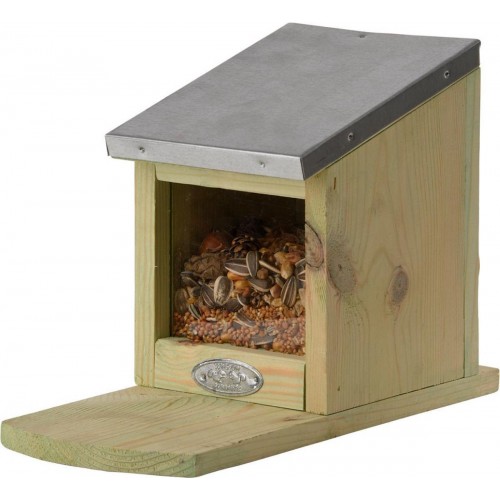 Dit speciaal voor de eekhoorns ontworpen voederhuis met beweegbare dak-klep kan zowel met noten als met eekhoornvoer gevuld worden. In korte tijd hebben ze ontdekt hoe ze het dakje van het voederhuis kunnen openen om bij dit voer te komen. Ze zullen het ter plekke opeten of ze verstoppen het in de tuin om een voorraad op te bouwen voor de winter. Bovendien laten deze vlotte dieren zich eenvoudiger observeren wanneer ze aan het eten zijn. Monteren via de sleutelgat ophanghaak aan de achterkant, het voederhuisje is te openen aan de onderkant.