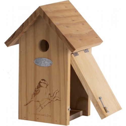 Houten vogelhuisje/nestkast voor de pimpelmees. Deze nestkast biedt een fijne plek om in te nestelen maar wordt tijdens de wintermaanden bij slecht weer ook graag gebruikt als schuilplaats. Aan de zijkant van het nestkastje zit een kijkluik. Het silhouet van de geschikte vogel voor dit vogelhuisje staat op de voorkant afgebeeld. Deze nestkast is ook geschikt voor de kuifmees, glanskop, matkop en zwarte mees. Materiaal: vurenhout.