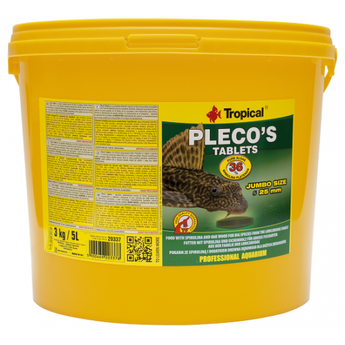 Tropical Pleco Tablets zijn grote zinkende tabletten met een diameter van 25 mm en geschikt voor bodem vissen. Het voer is bij uitstek geschikt voor vissen die van nature schrapend eetgedrag vertonen (bijvoorbeeld vele L-nummers). Deze tabletten bevatten een erg hoog percentage spirulina alg (36%). Ook is er aan het voer eikensnippers toegevoegd.