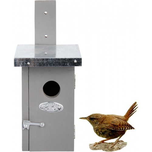 Dit nestkastje is geschikt voor de winterkoning. Een rechthoekig huisje dat gemakkelijk aan een boom of muur bevestigd kan worden.